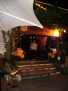 For Halloween night, we went to Tawandang German Brewery in Bangkok. The wait staff was generally dressed up (witches, vampires, ghosts, and the Joker seemed to be the themes), which fit right in to the general eclectic nature of the place. It's a brewpub shaped like a barrel that seats 1000+ serving German style beers brewed on the premises and catering mostly Thai food and a few Thai style German dishes to constant entertainment (gamelan orchestra, dixiland jazz, lounge acts) and karaoke. The staff behind the bar spent the whole time filling tube shaped towers of beer and carrying them like rifles to the various tables.