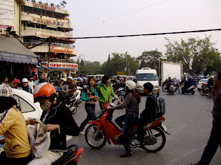 Here you can see some folks eating while sitting on the sidewalk on small stools - a common way to dine out in Hanoi. You can get citrus-flavored pork wrapped in banana leaves on the street, too (this one at a bia hoi joint). Also pictured is some fried beef noodles from the pho place, the best of all possible mojito worlds (a huge glass stuffed with lime and mint, it was incredible), and someone making rice paper for wrapping spring rolls. Ah, Hanoi - what wonderful food you have.