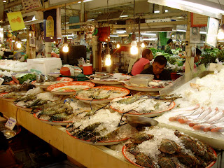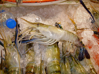 You get some food pics for Christmas -- we went to a 'wet' market after Chatuchak market, and saw some fresh seafood. I liked how the squid had 'lost their ink'. Also - note the sheer size of that prawn - bigger than a bottle of water! The bags of dried seafood were fresh, if that makes sense - fish and seafood was being dried on site.